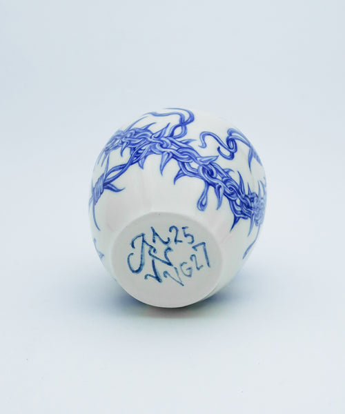 Each vase is cast in porcelain, hand-painted with cobalt blue underglaze, then glazed and fired in Copenhagen. Every vase is one of a kind, signed, and numbered.