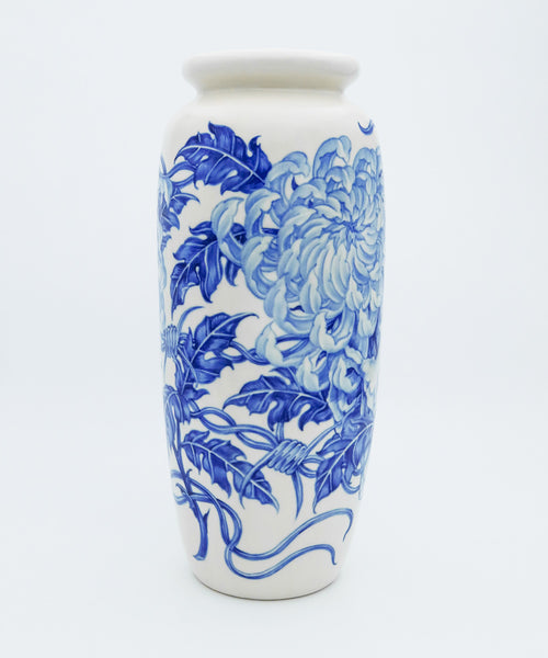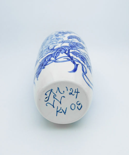 Each vase is cast in porcelain, hand-painted with cobalt blue underglaze, then glazed and fired in Copenhagen. Every vase is one of a kind, signed, and numbered.